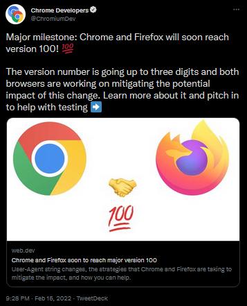 كل من Firefox و Chrome قريبان من الاصدار المئة قد يحدث بعض المشاكل لعدد قليل من المواقع و ذلك للارقام الثلاثة المشفرة للـ 'User-Agent' (UA) للمتصفح.